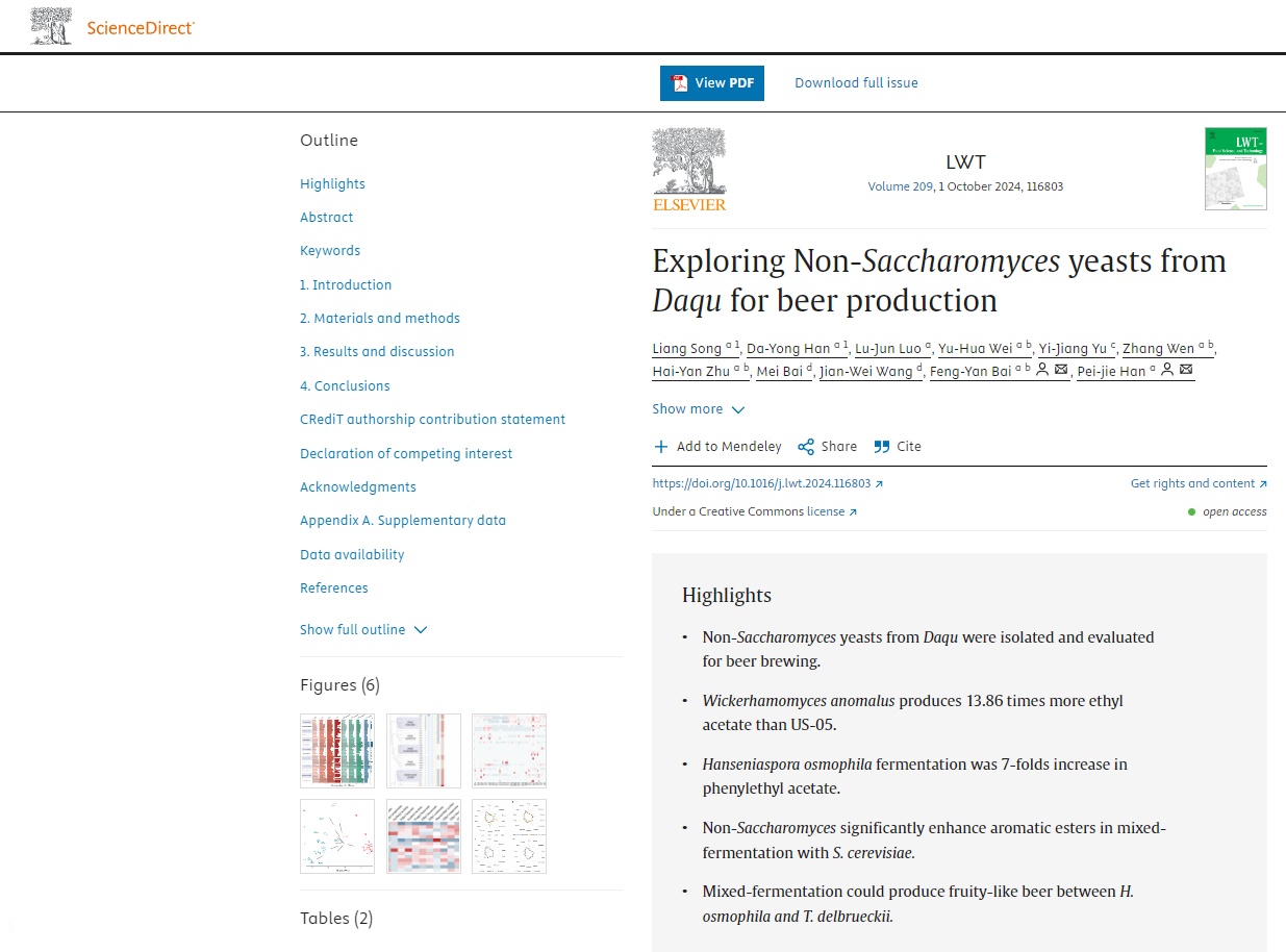 近日,中國科學院微生物研究所在國際期刊LWT-Food Science and Technology(《LWT-食品科技》)上發(fā)表了一篇論文——《Exploring Non-Saccharomyces yeasts from Daqu for beer production》(《探索來自大曲的非酵母酵母用于啤酒生產(chǎn)》)。