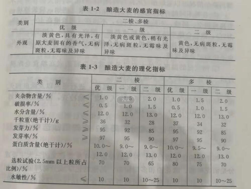 鑒別原料大麥的質(zhì)量主要從外觀質(zhì)量、物理檢驗(yàn)和化學(xué)檢驗(yàn)三個方面著手。其質(zhì)量標(biāo)準(zhǔn)分為感官指標(biāo)和理化指標(biāo)兩大類,并依此將大麥分成三個等級(表1-2、表1-3)。